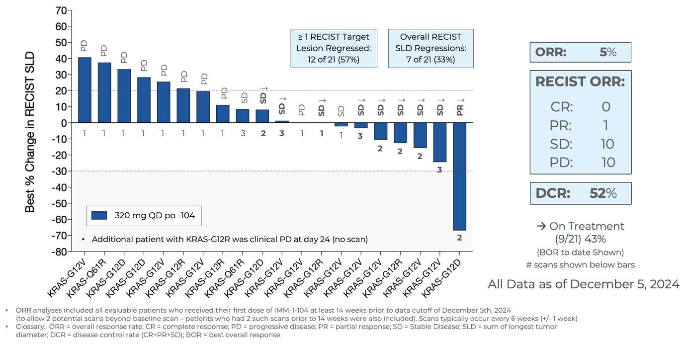 - As of December 5, 2024, eleven of the twenty-one evaluable patients treated in the Phase 2a arm assessing IMM-1-104 as monotherapy in second-line pancreatic cancer achieved disease control, including one patient with 67% target lesion shrinkage (PR). Nine patients remain on treatment.